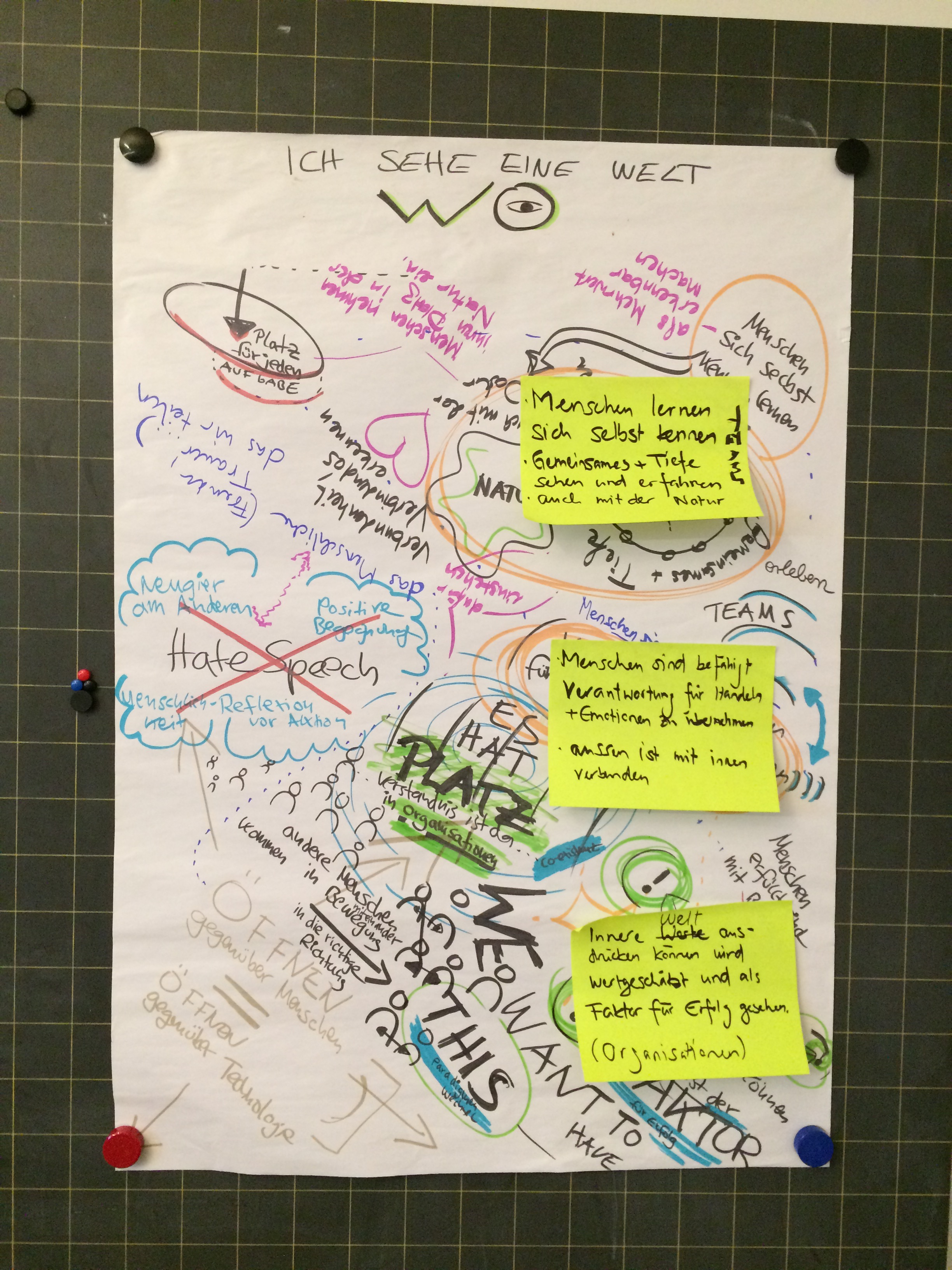 Transition in die Praxis: Wir haben den Anspruch, dass die gemeinsamen Tiefenerfahrungen in den Arbeitsalltag einfliessen können. Vom Einstieg über die Naturerfahrung kommend, haben wir kreative Arbeitstechniken (siehe Bild) angewendet, um am Tag darauf auf dieser Basis unsere Webseite zu launchen!