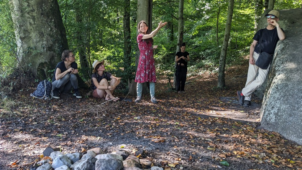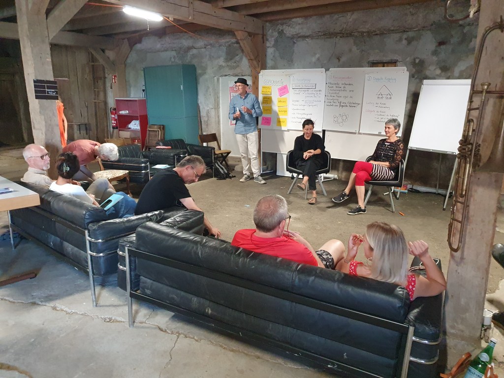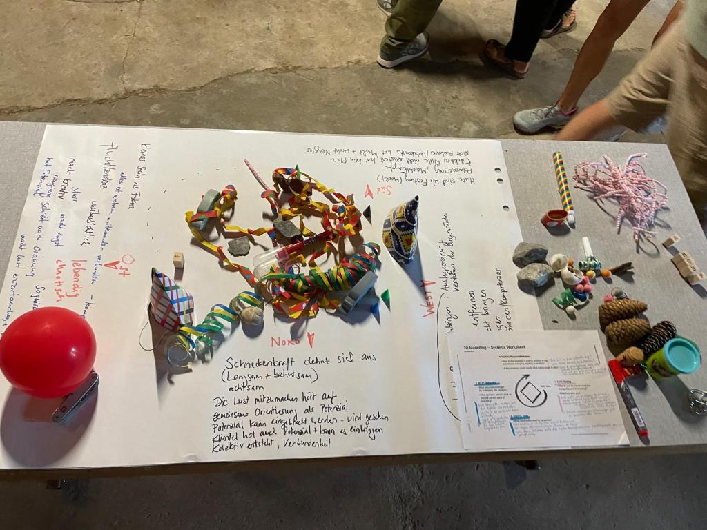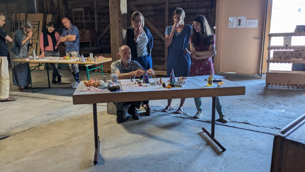 Am Donnerstag sind wir mit einer Aufstellung zu Vertrauen und einer Teilete rund ums Feuer gestartet. Der Freitag Morgen war für das U Lab reserviert, an dem wir Modelle von Veränderungssystemen jetzt und in Zukunft gebastelt und darüber aus vier Himmelsrichtungen reflektiert haben. Am Nachmittag haben wir uns langsam und still der Kraft der Natur auf dem Megalithweg hingegeben.